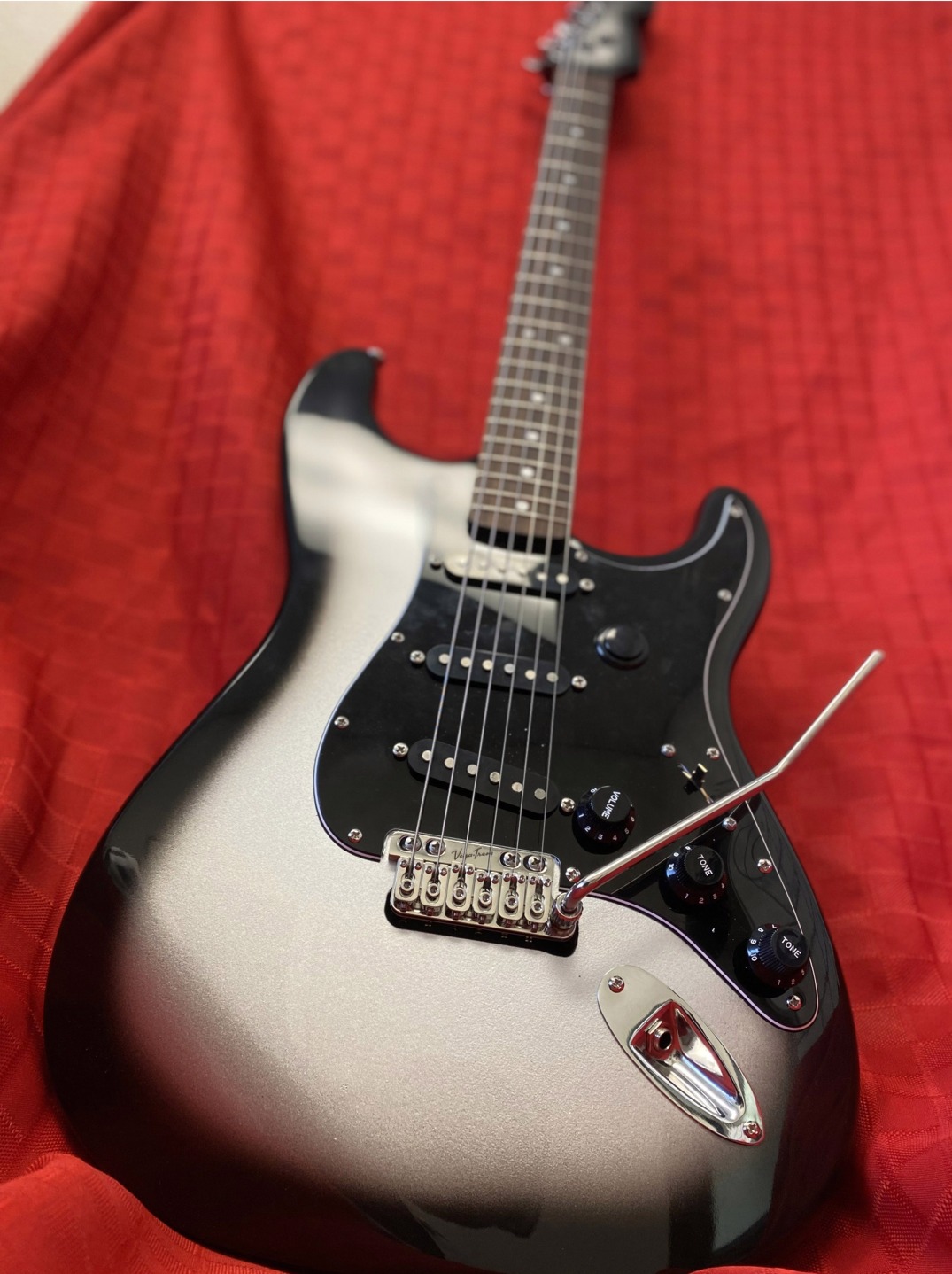 Parts supplied and assembled by FBD of a personalized Fender "Patocaster" parts guitar from farther to son in metallic silver with black burst to the body and neck